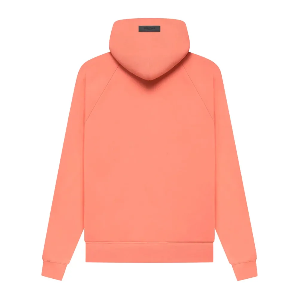 The FOG Essentials Hoodie Coral is made of a cotton fleece blend in an oversized fit with a bright pink color. The sweater has a large flocked tonal logo across the chest with a rubberized patch on the brim of the hood. The hoodie has a kangaroo pocket on the chest along with ribbed details along the hem and cuffs.