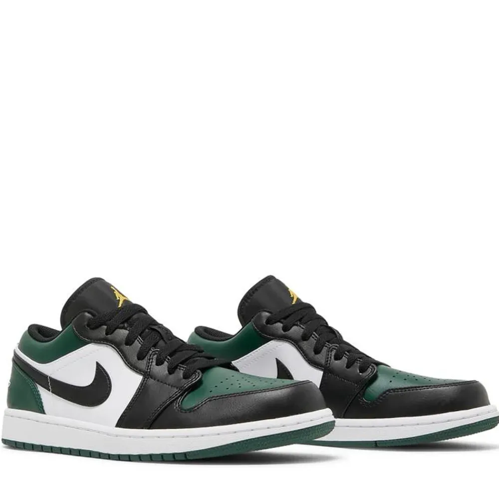 The Jordan 1 Low Green Toe features white, black, and Noble Green leather upper with black Swooshes and tongues. In alignment with other Bred Toe-inspired color blocked designs, the Green Toe opts for a green perforated toe box blocked in with a black leather toe wrap. A white and green Air sole completes the design.