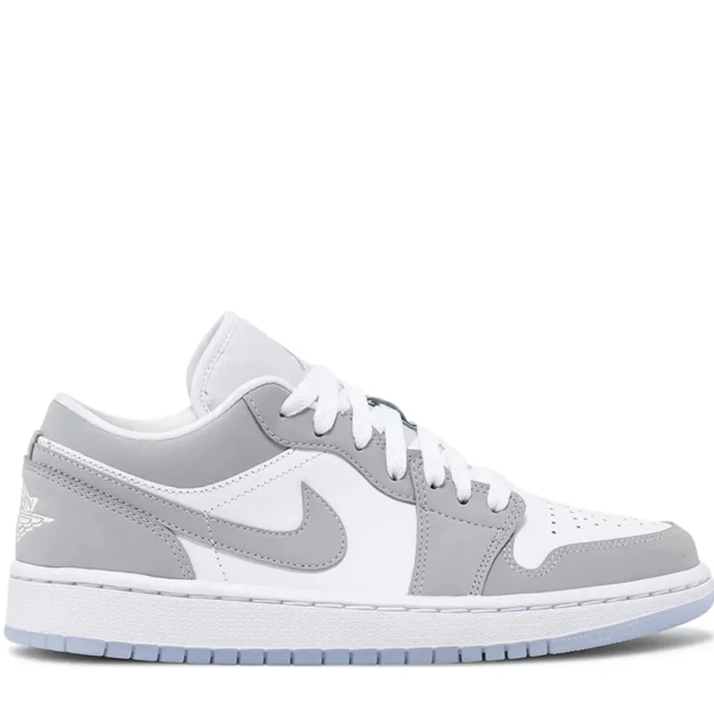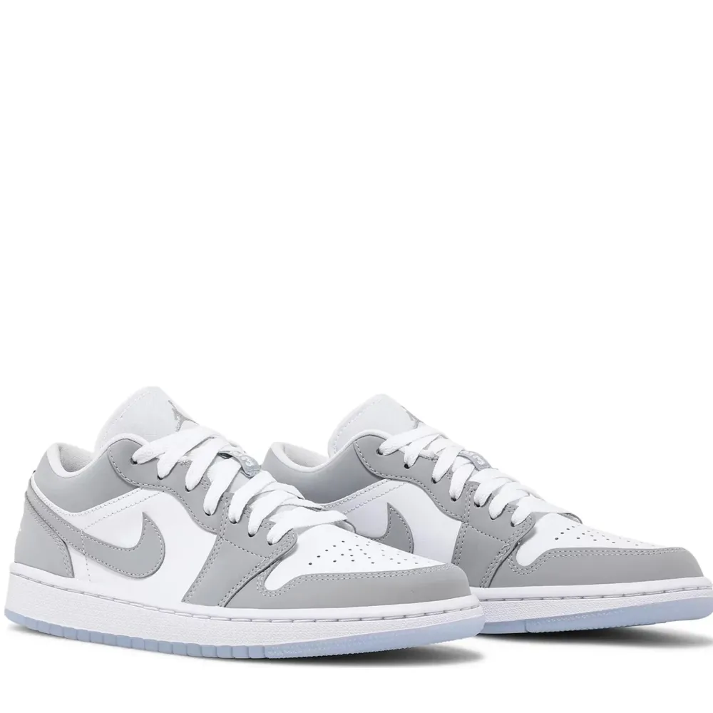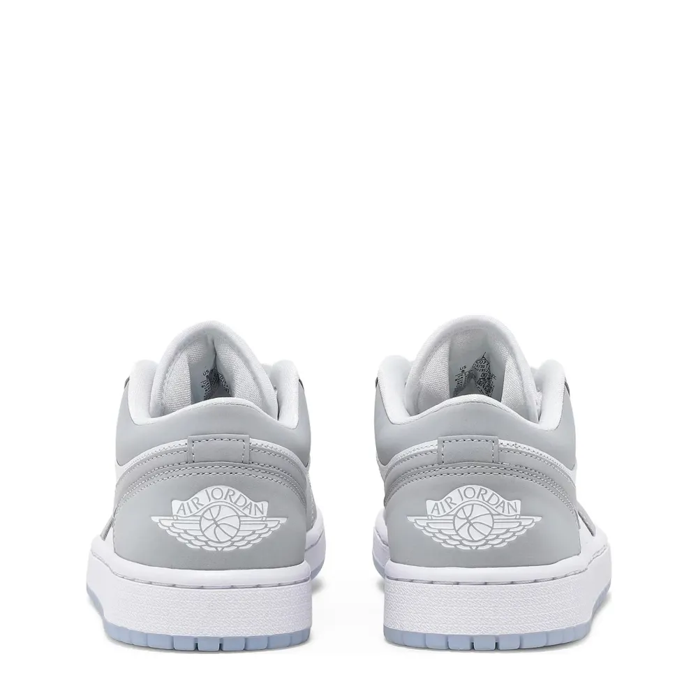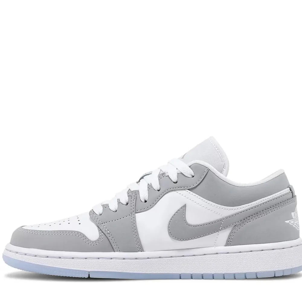 The Jordan 1 Low Wolf Grey (W) features a white leather upper with Wolf Grey Durabuck overlays and Swooshes. From there, a Jordan Wings logo on the heel and a translucent outsole adds the finishing touch.