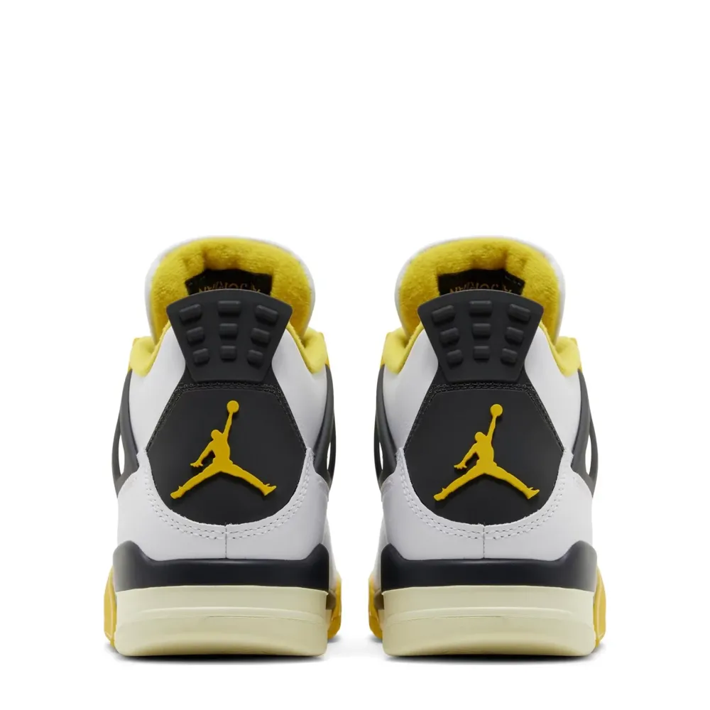 The Jordan 4 Retro Vivid Sulfur (W) is built with smooth white leather featuring signature AJ4 details, including breathable quarter panel netting and black TPU support wings. Contrasting yellow accents land on the molded eyelets, interior lining, and the Jumpman branding hits that adorn the tongue and back tab. The sneaker rests on a two-tone polyurethane midsole, fitted with a visible Air-sole unit in the heel.
