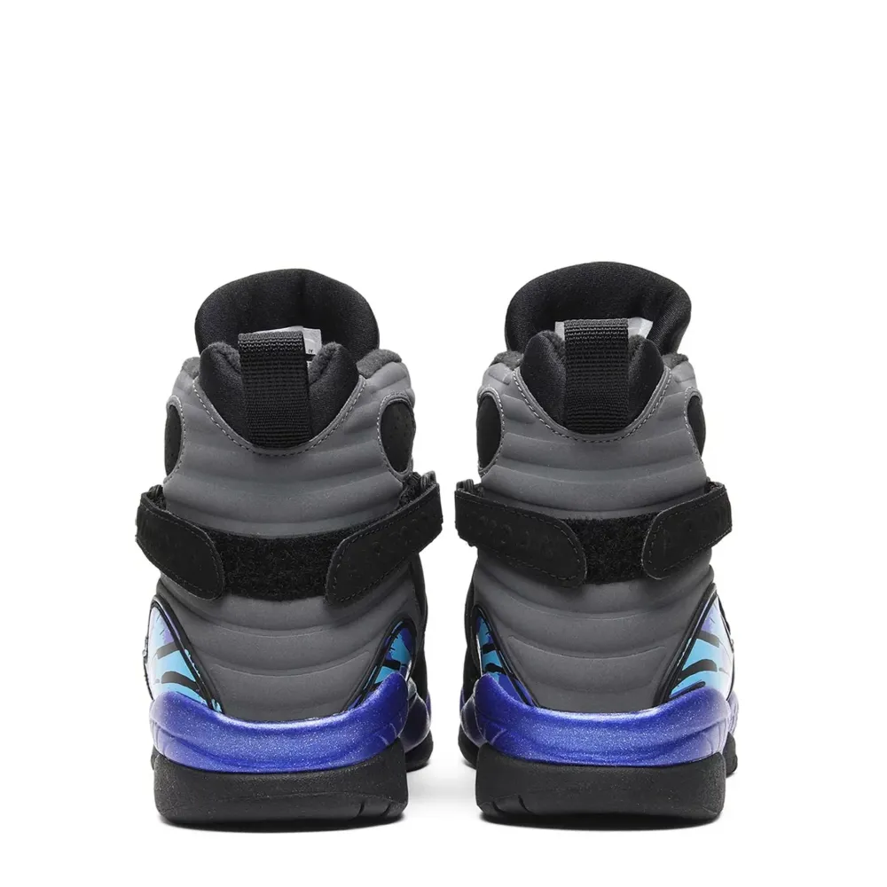 This 2015 Air Jordan 8 is made of a durabuck upper that is black colored. The sneaker has a design that features anti-inversion cross straps, an AIR sole, an inner sleeve, as well as a polycarbonate torsion plate. This high-top shoe also boasts additional aqua and purple tones at the back end, and the base in an abstract pattern. A lacing system with black laces finishes the overall look.
