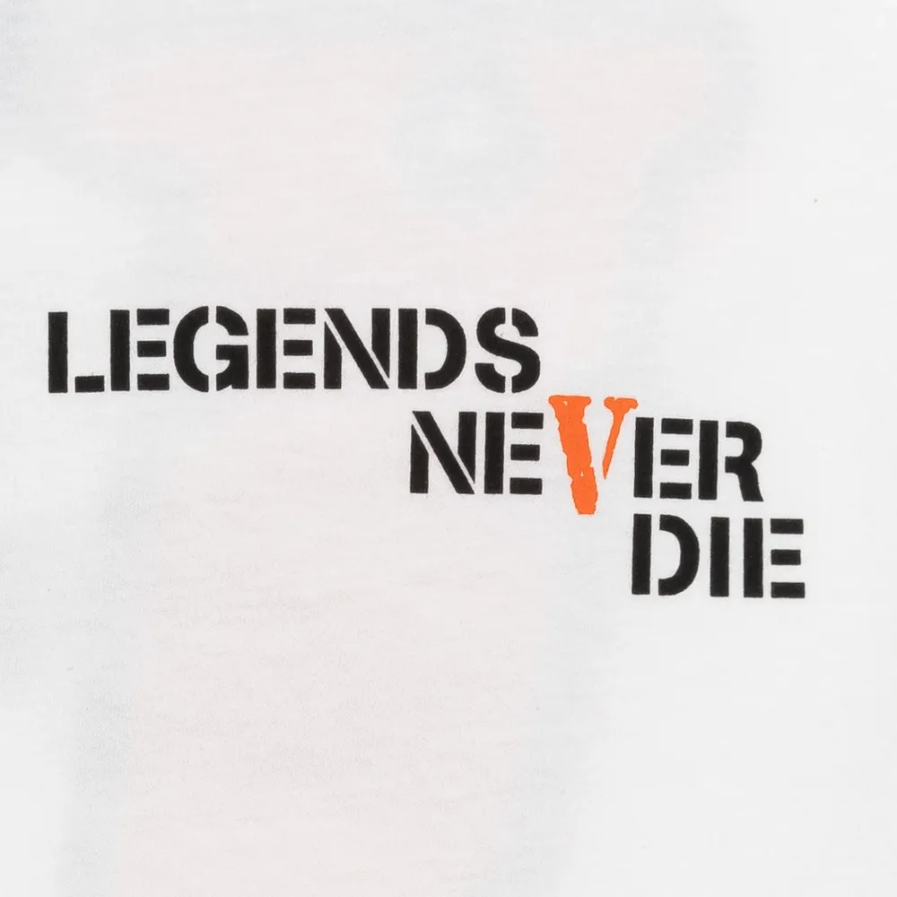 Since its release in the late Summer of 2020, this Juice Wrld x Vlone t-shirt has become one of the most popular artist merch t-shirts at Plus. The t-shirt features the phrase “Legends Never Die” on the front and a Vlone logo surrounded by monarch butterflies on the back. The t-shirt was released to honour the late artist’s life Juice Wrld.