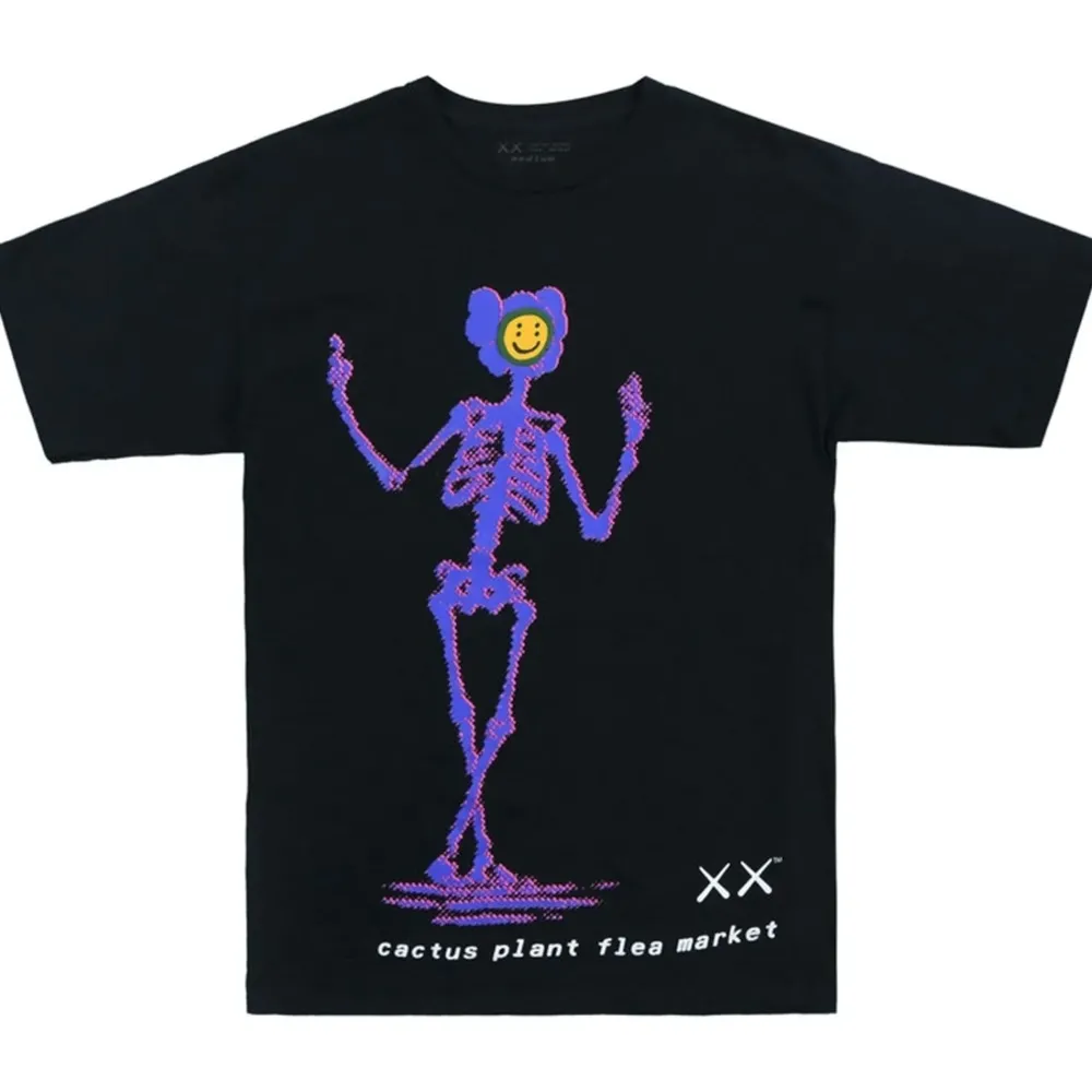 This KAWS x Cactus Plant Flea Market T-shirt was released in two different colors as a part of a larger collaboration in honor of the artist’s October 2021 Fortnite collaboration. The t-shirt features a purple KAWS Companion Skeleton with a Cactus Plant Flea Market smiley face covering the face of the skeleton.