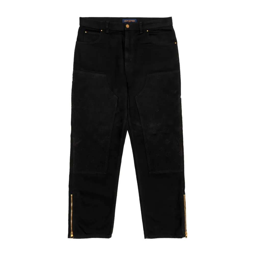 These Louis Vuitton Monogram Detail Carpenter Denim Pants Black (FW22) are made from washed black denim in a slightly loose fit. They are distinguished with embossed panels and pockets featuring an allover Monogram motif that adds textural detail. A hard-working wardrobe staple that can be paired with almost anything.