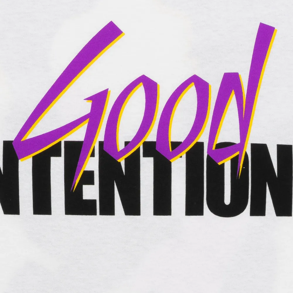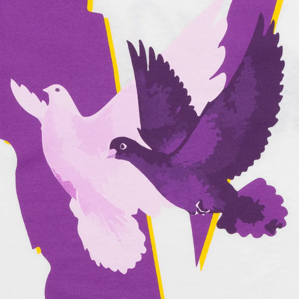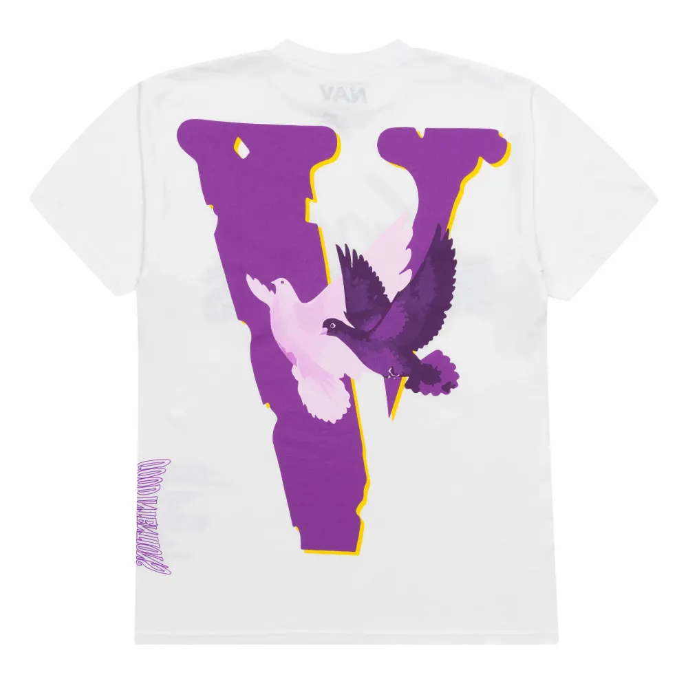 This White Nav T-shirt was released in May of 2020 as a part of the merchandise package that was made available alongside his new album, Good Intentions. The front of the t-shirt features the album’s title in purple, yellow, and black print coloring and the side of the t-shirt features the Nav album’s tracklist in the same colors. The back of this Nav t-shirt features a large purple and yellow Vlone logo with two doves flying over it.