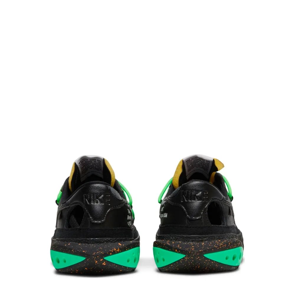 The Nike Blazer Low Off-White Black Electro Green boasts a multi-disciplinary, multi-sport aesthetic – a central motif in Virgil Abloh’s body of work. Encompassing aspects of basketball, skateboarding, and trail running silhouettes, the Off-White Blazer Low fuses an Air Terra Humara TPU heel piece with a classic vulcanized sole for a unique base. On the black leather upper, punched-out holes are scattered, similar to the Air Jordan 5 Off-White. An accented Electro Green over-lacing system, exposed foam tongue, zip tie tag, and Swoosh tab all add Off-White’s signature detailing to complete the design.