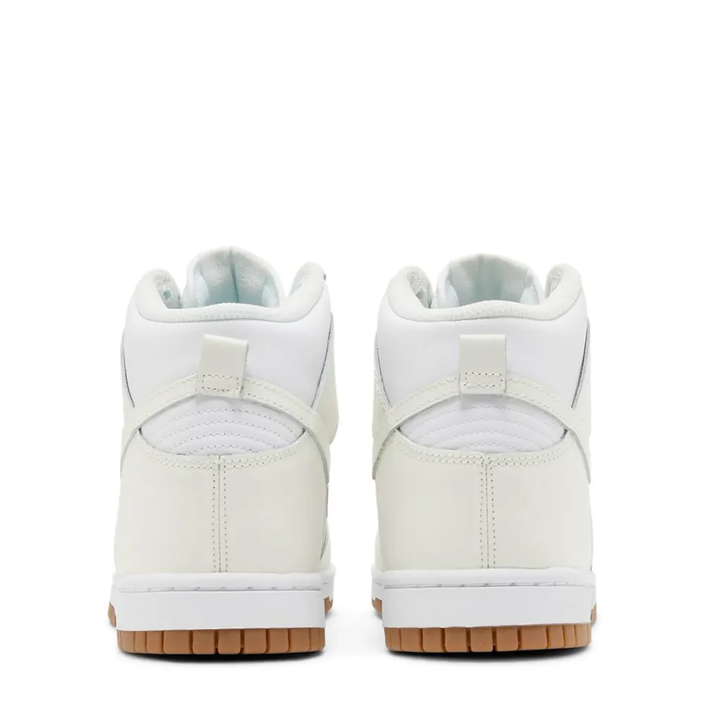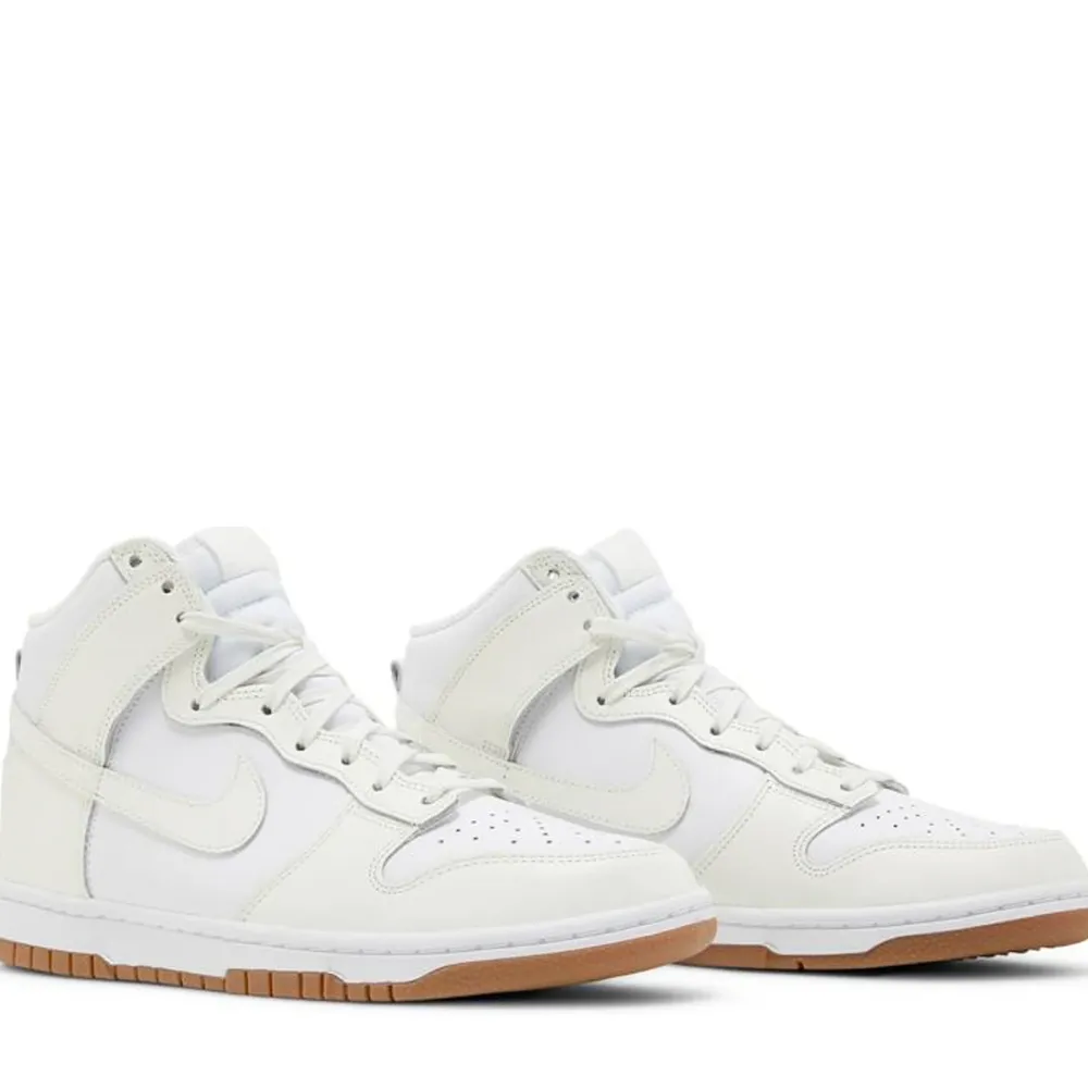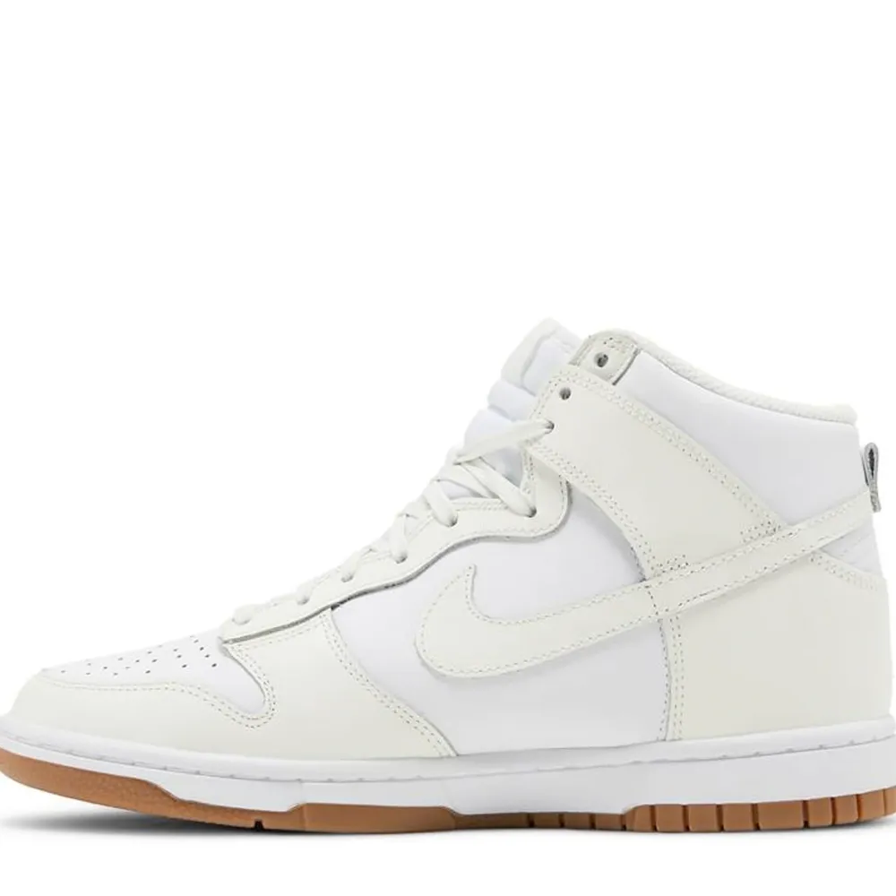 The Nike women’s Dunk High ‘Sail Gum’ treats the timeless silhouette to an equally timeless color scheme. The high-top utilizes an all-leather upper that weds a pristine white base with subtle off-white overlays at the forefoot and heel. Details include a perforated toe box, a padded high-cut collar and a breathable nylon tongue. Underpinning the sneaker is a white rubber midsole, reinforced underfoot by a gum rubber outsole originally designed for pivoting on the hardwood.