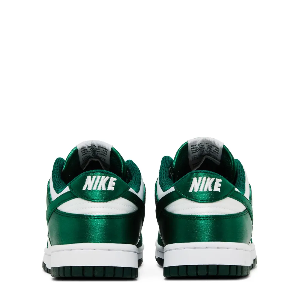 The Nike Women’s Dunk Low ‘Satin Green’ merges classic two-tone color blocking with a luxurious build. Secured with laces that feed through metal eyelets, the shiny satin upper combines a white base with contrasting green overlays and a color-matched Swoosh. A woven Nike tag adorns the tongue, while an embroidered Nike wordmark graces the back tab. The sneaker is mounted on a sturdy cupsole, featuring white sidewalls and a green rubber outsole.