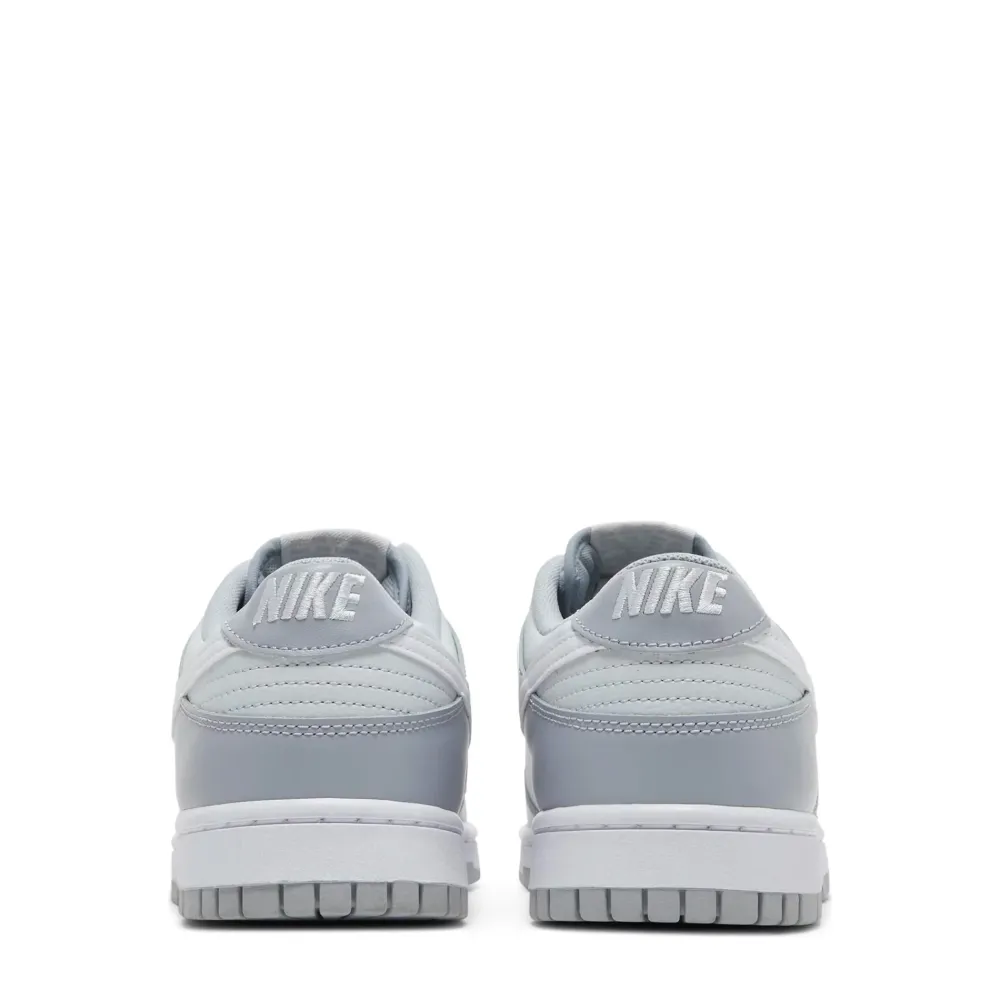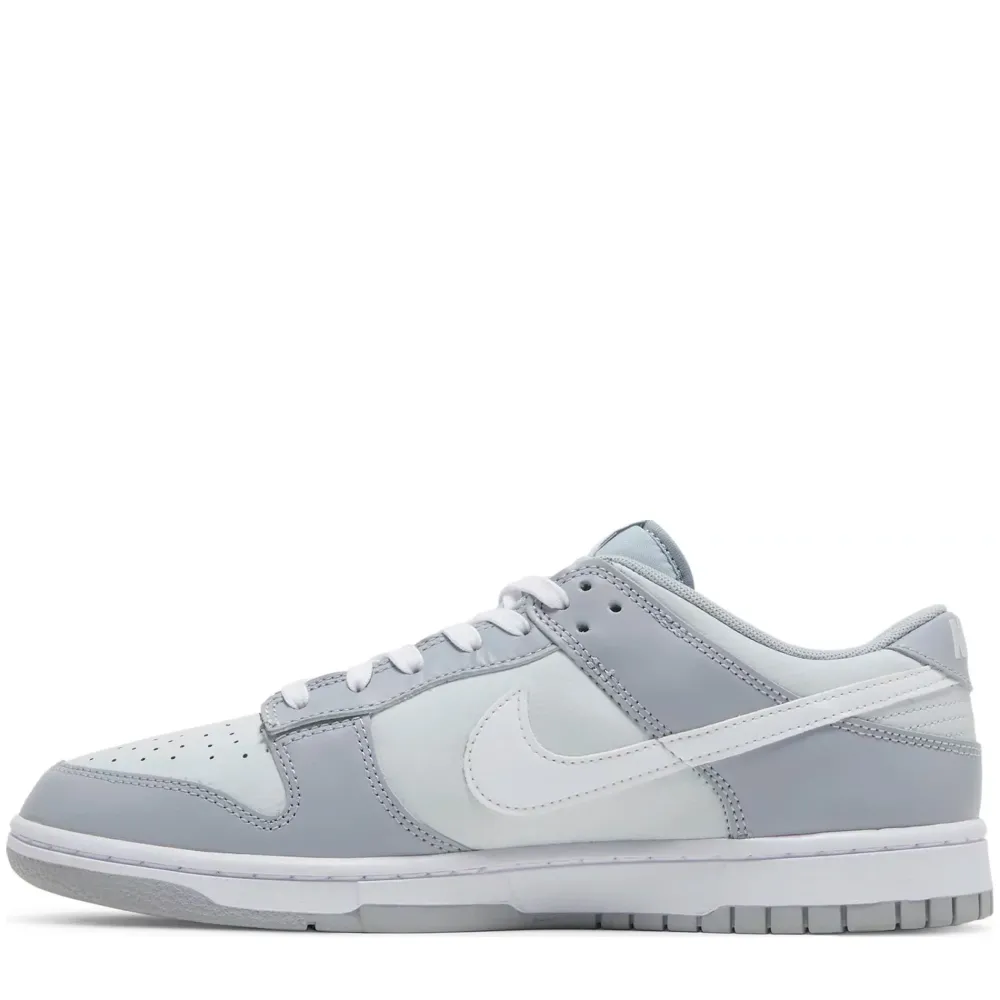 The Nike Dunk Low Two Tone Grey features a white leather base, accompanied by grey leather overlays on the eyelets, mudguard and heel.