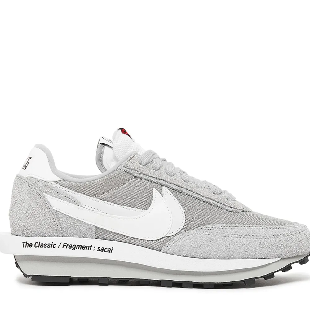 The Nike LD Waffle sacai Fragment Grey features a grey mesh upper with layered suede overlays and white leather doubled Swooshes. On the side of the doubled sole, both sacai and Fragment branding is printed in black. From there, a doubled tongue with woven labels completes the design.
