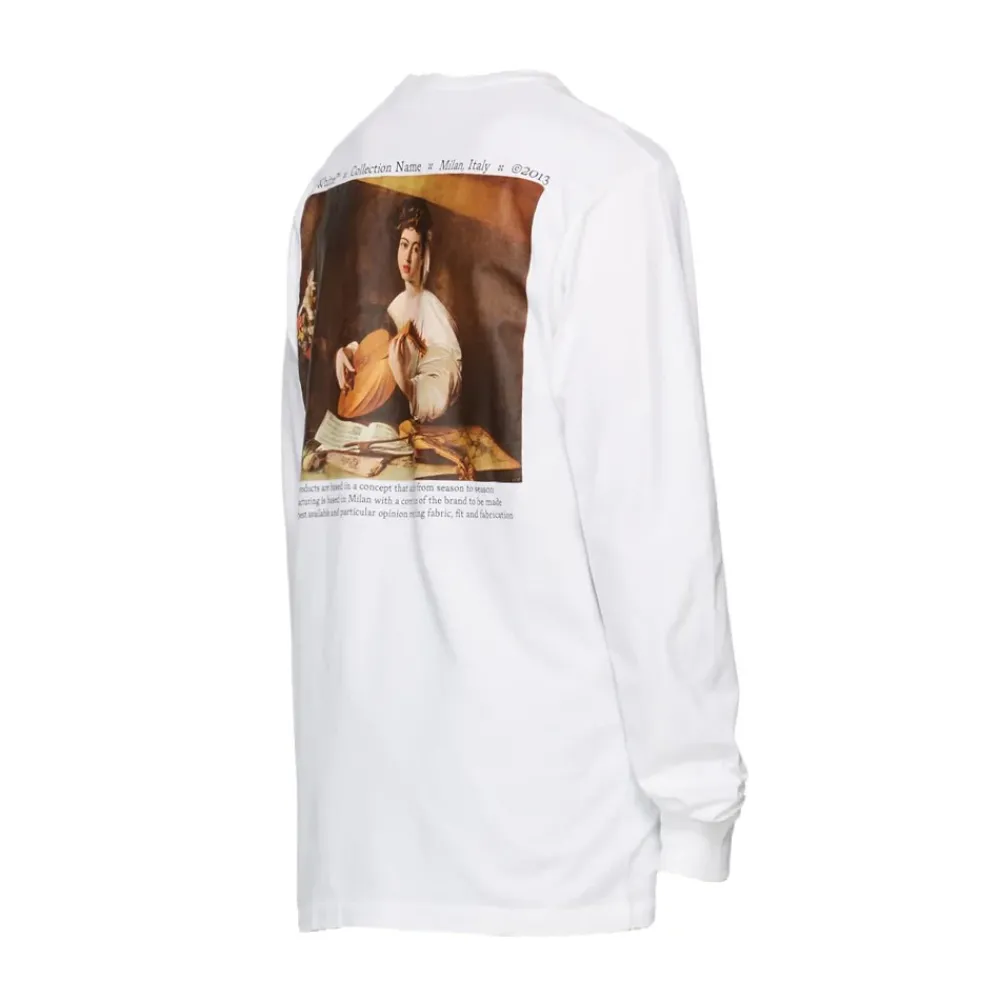 Long sleeve cotton jersey T-shirt in white. Rib knit crewneck collar. Logo printed in black at chest. Graphic printed in black at back.
