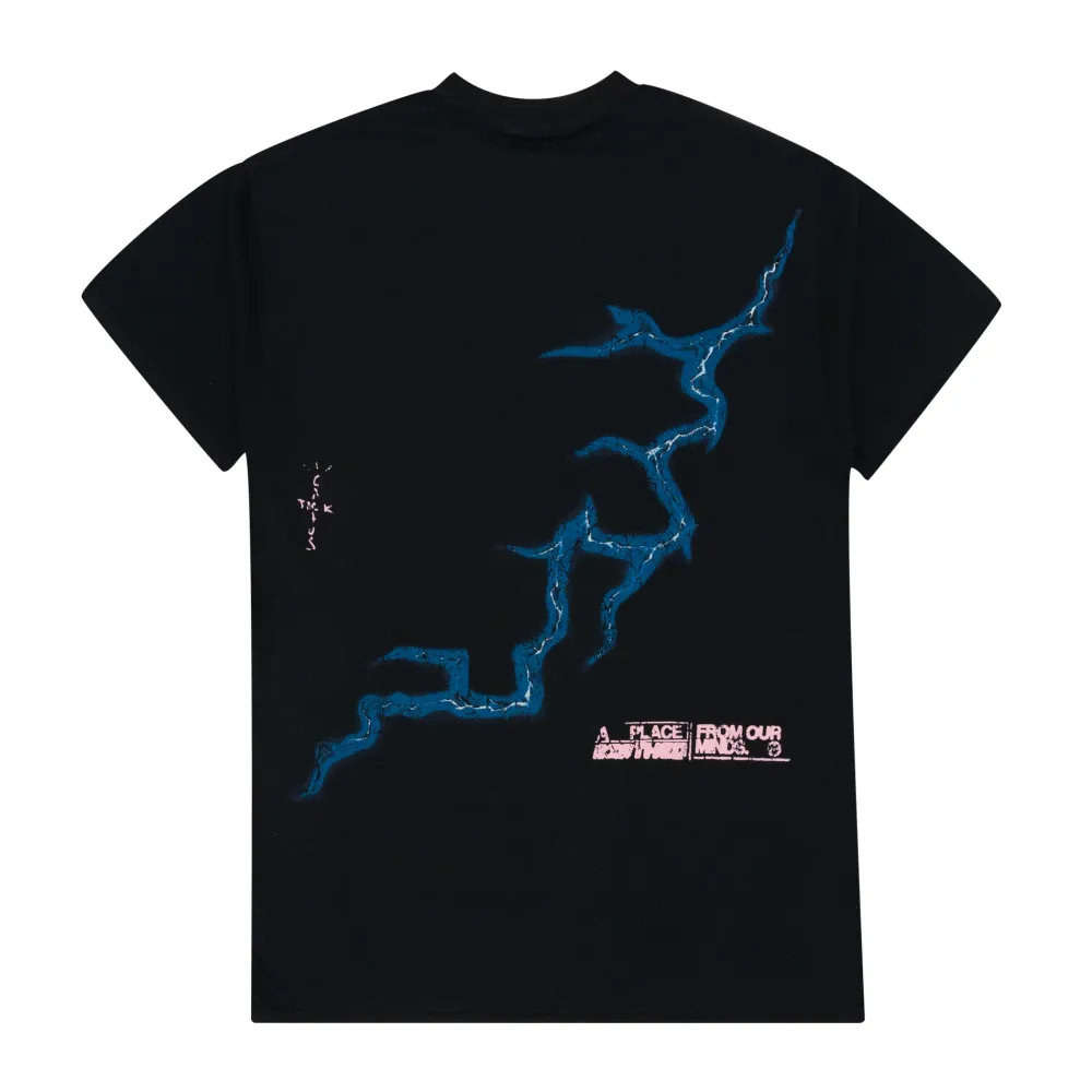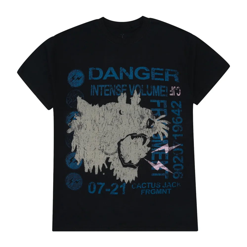 This Travis Scott x Fragment T-shirt features an array of distressed graphics as well as branding from both partners.