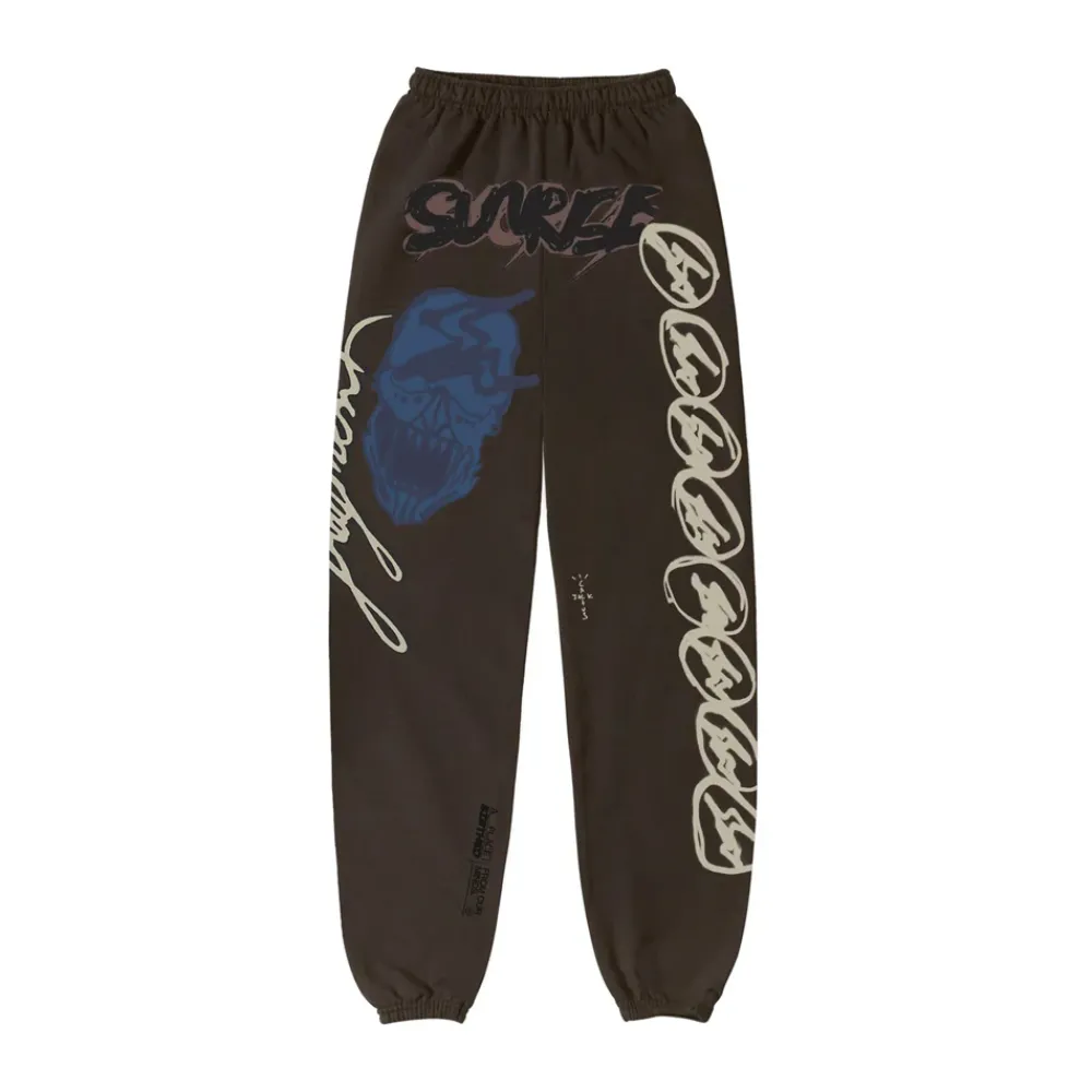 This Travis Scott x Fragment sweatpant features an array of graphics as well as branding from both partners.