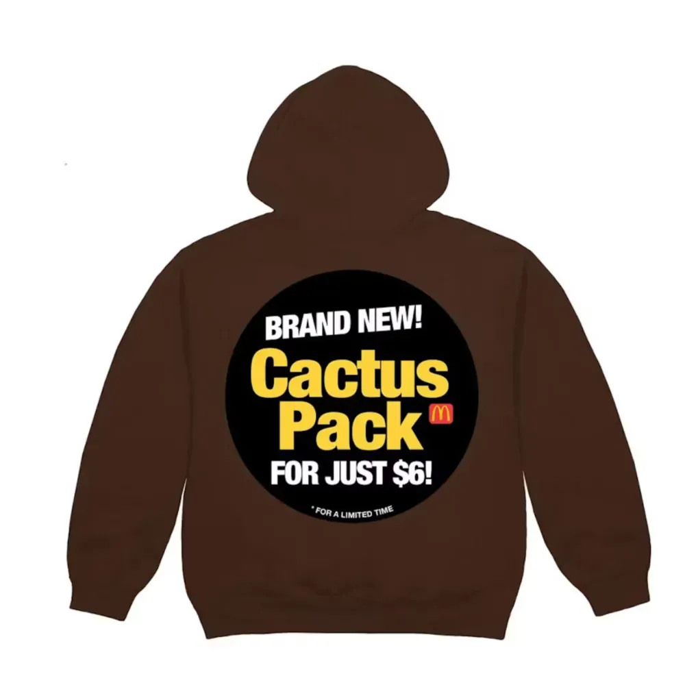 Travis Scott and McDonald’s released more than 80 different apparel items and accessories as a part of their collaborative merchandise capsule including t-shirts, hoodies, a massive Chicken McNugget Body pillow, and more. This hoodie features both a McDonald’s Logo and a Cactus Jack logo on the front with a Travis Scott Cactus Pack promotional sticker graphic on the back of the piece.