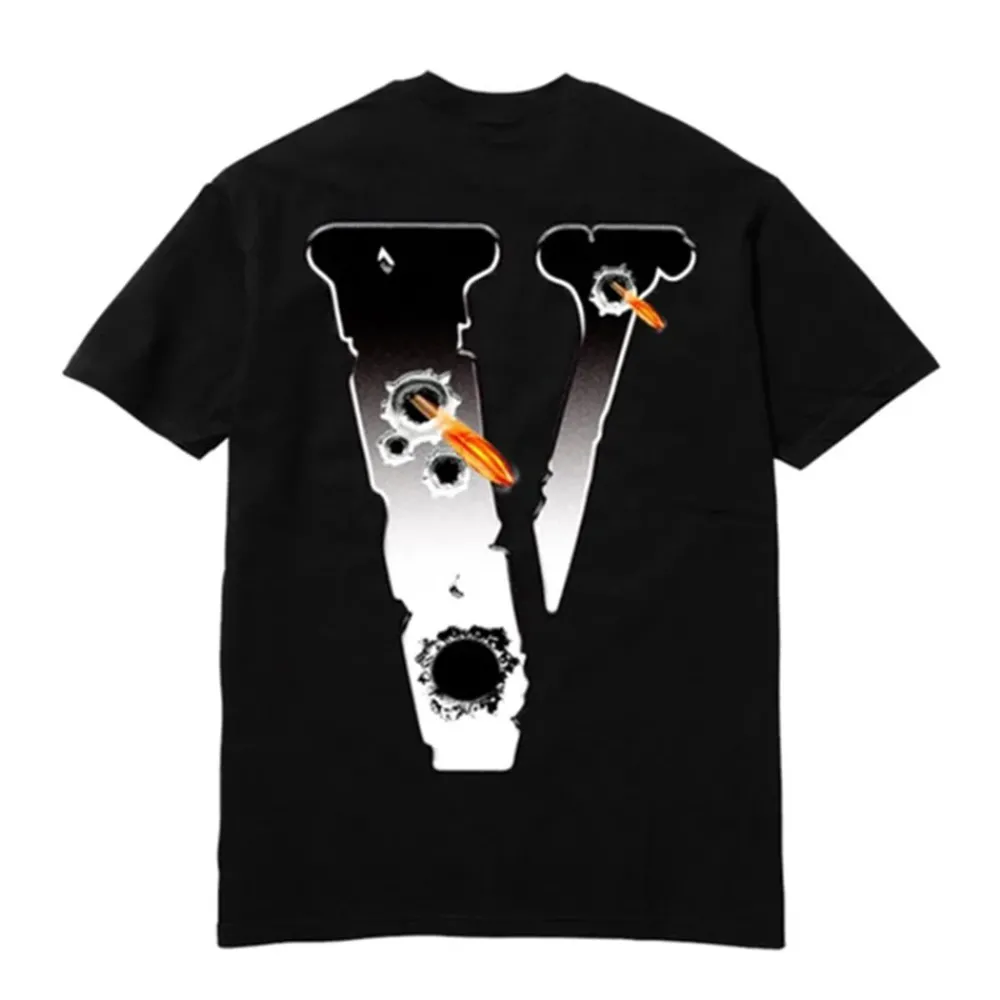 The Pop Smoke x VLONE Hawk Em Tee features a crisp, dark background that maintains simple lines and puts the focus on the center logos, which are on the front and back of the shirt. For the front, the metallic “Hawk Em” slogan is set in bright tones against the black background. Smoking holes accent the piece and drift up toward the collar in clouds. On the back of the T-shirt, the large “V” logo of VLONE is depicted in a similar colour scheme, and it includes matching holes.
