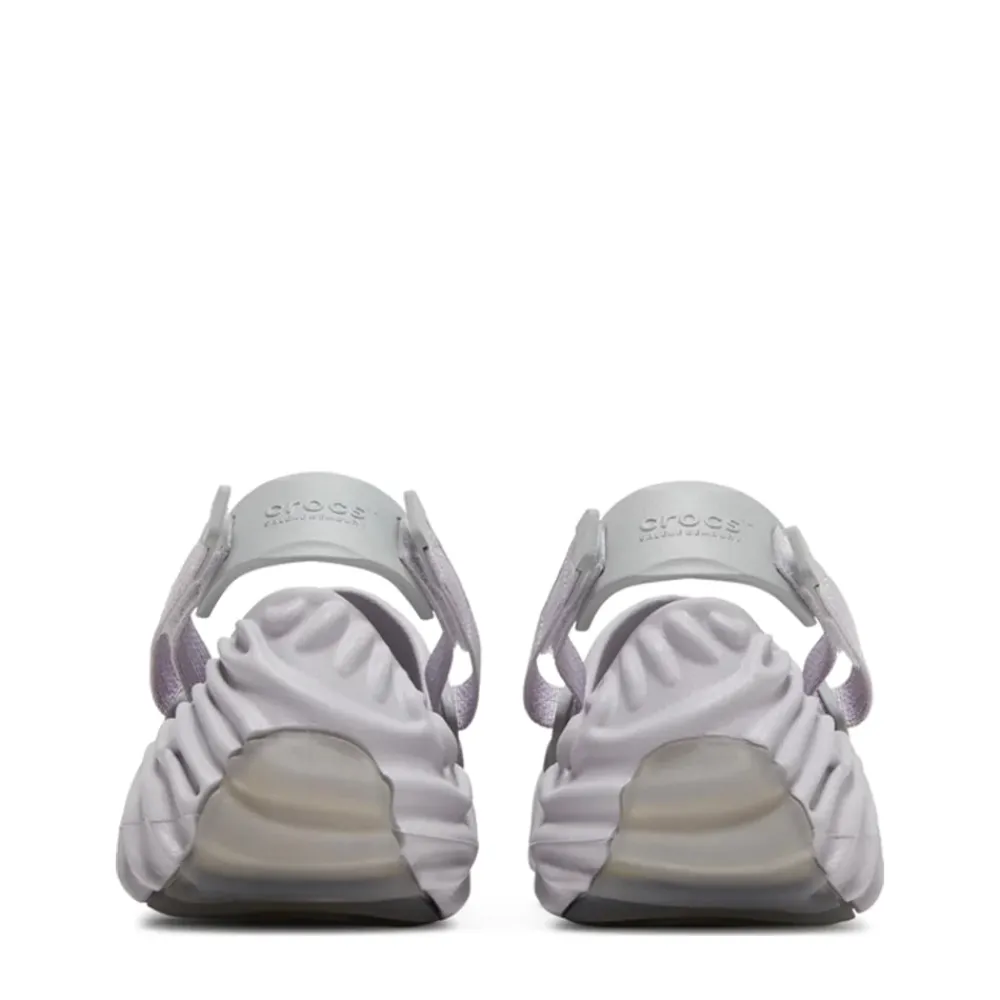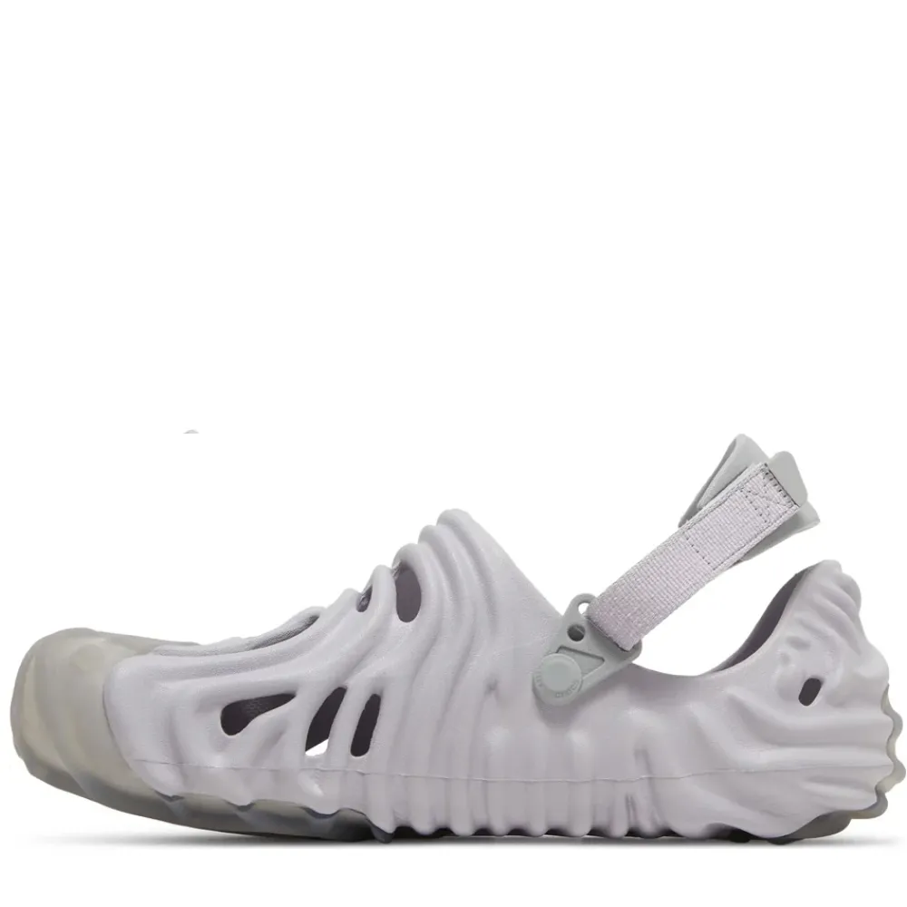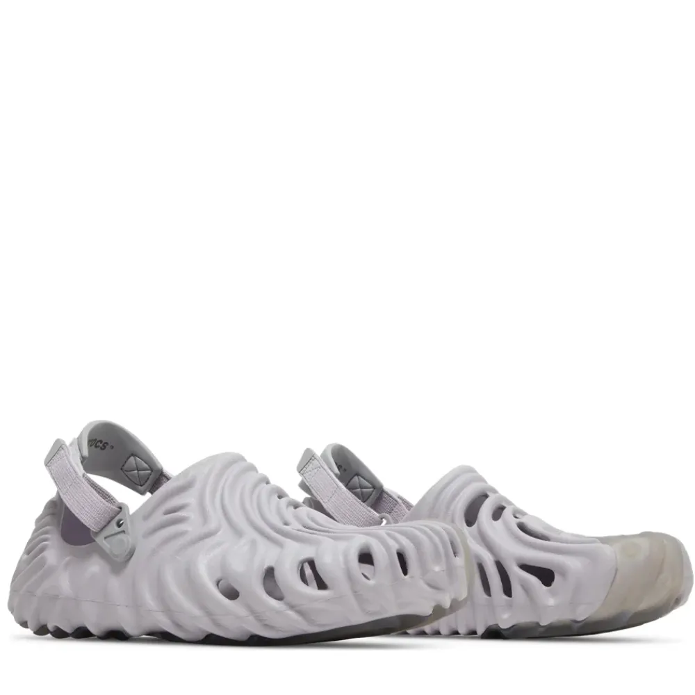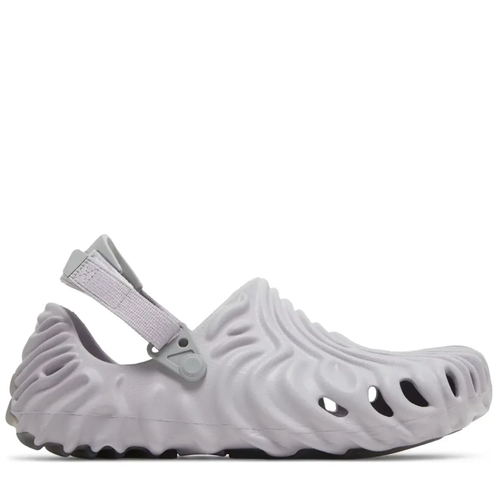 The Crocs Pollex Clog Salehe Bembury Urchin arrives in a light purple, exo-skeletal look with dramatic, fingerprint-like concave ridges throughout its foam construction. While there aren’t as many ventilation holes in this design compared to traditional Crocs Clogs, the remaining holes are located on high-heat areas of the foot for increased breathability. A removable canvas strap at the ankle provides wearers with an option for a more-secure fit.