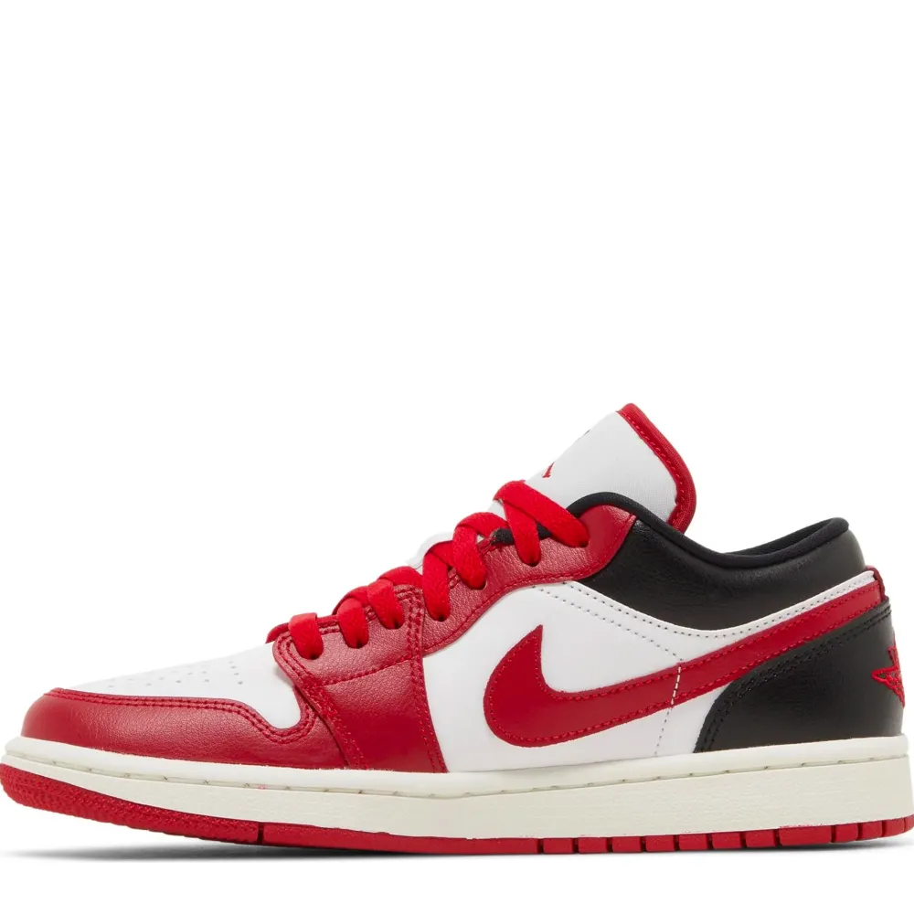The Jordan 1 Low Reverse Black Toe is constructed in the full leather, featuring mesh tongues and lining. The shoe has a crisp, white base with red and black overlays. The crimson Swoosh sits atop the white midsole while the rubber outsole matches the branding in colour.