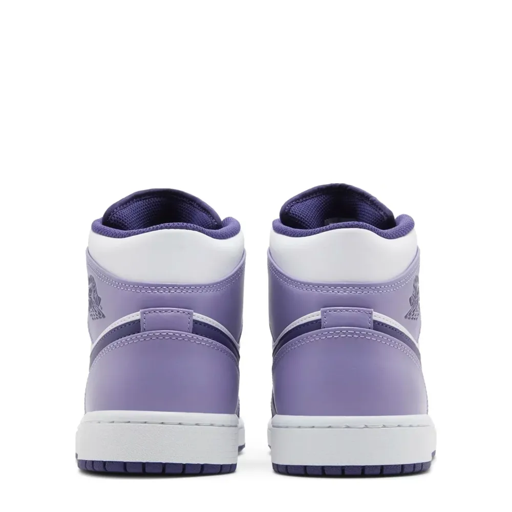 The Jordan 1 Mid White Sky J Purple / Blueberry (GS) makeover comes clad in a “Sky J Purple/White/Sky J Light Purple” color scheme. The upper of the shoe is constructed out of leather material, which is supple and smooth to touch. The underlay of the shoe comes clad in a crisp white hue, which is wrapped in several shades of purple leather overlays. The white hue can be seen upon the midfoot panels, vamp, and tongues.