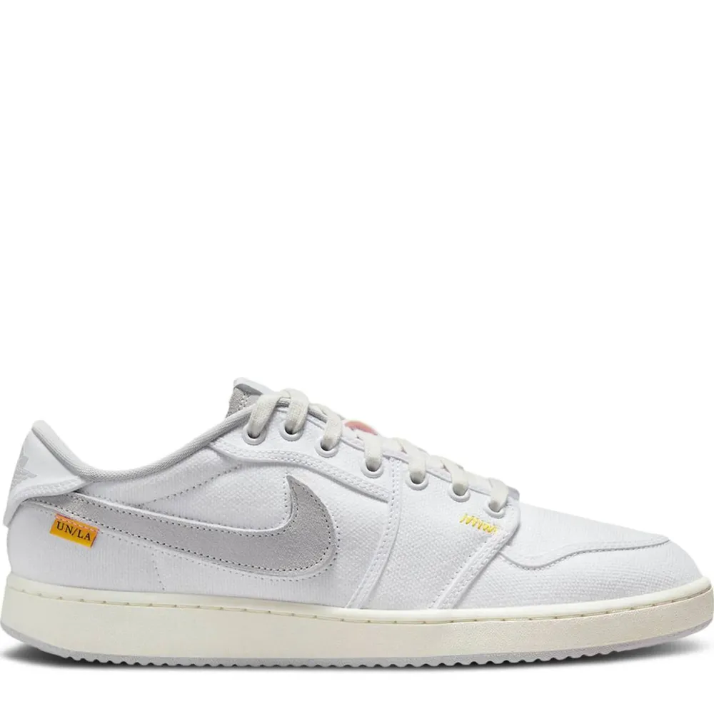 The collaboration between Union and Jordan brand comes with a white and neutral grey canvas upper, sail midsoles, and yellow stitching accents. The Jordan x Union AJKO Low SP features removable blue and grey swoosh patches with Union LA branding placed below.