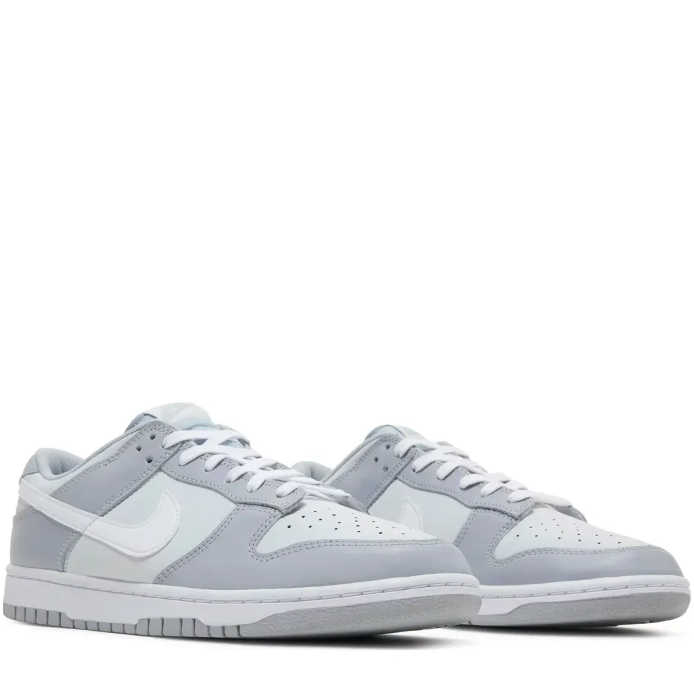 The Nike Dunk Low Two Tone Grey features a white leather base, accompanied by grey leather overlays on the eyelets, mudguard and heel.