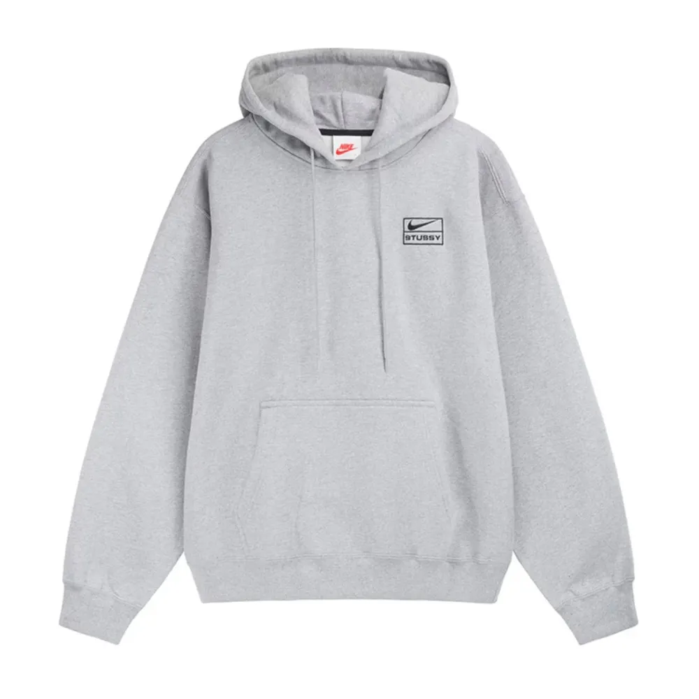Made from a soft cotton blend, this grey hooded sweatshirt features ribbed cuffs for a snug feel. It’s cut to a relaxed fit and features custom Nike x Stüssy co-branding across the front.