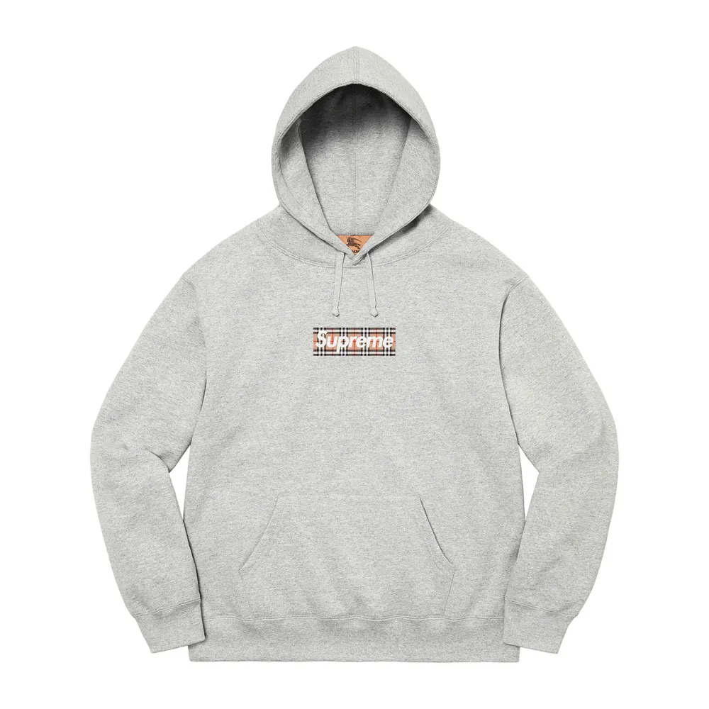 Supreme and Burberry released this Supreme Burberry Box Logo Hoodie in gray, alongside more than 40 other apparel items, as a part of their Spring/Summer 2022 Week 3 collaboration.