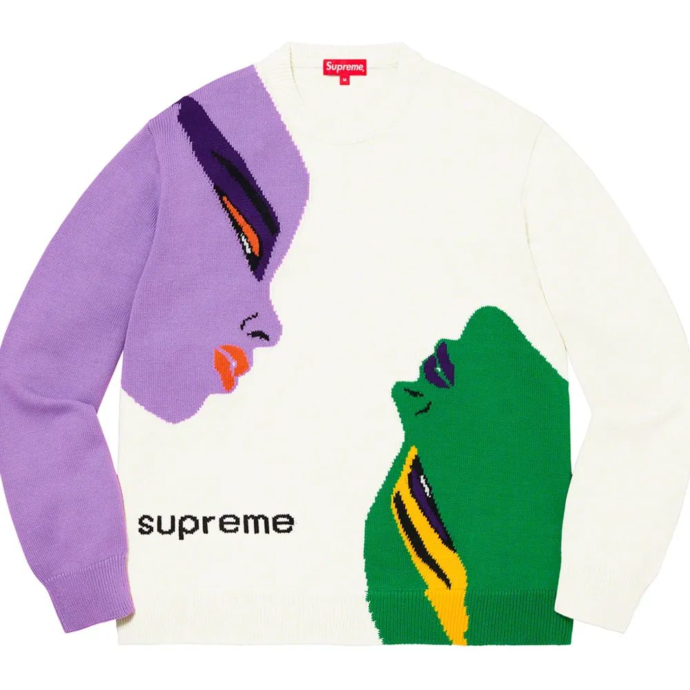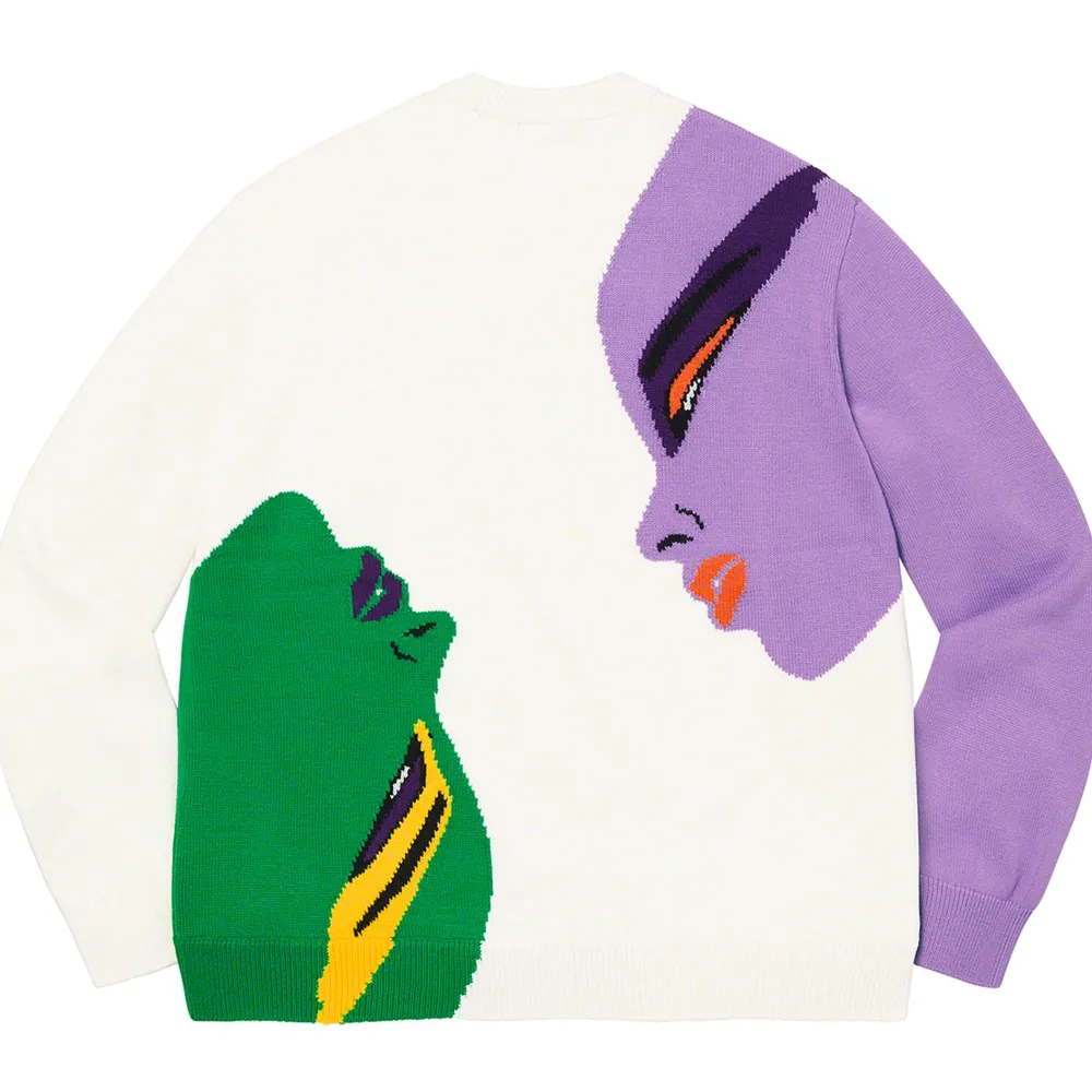 The Supreme Faces Sweater was released in two different colors: black and cream. The cream colorway of this Supreme Faces Sweater features two faces, one purple and one green, looking at each other.