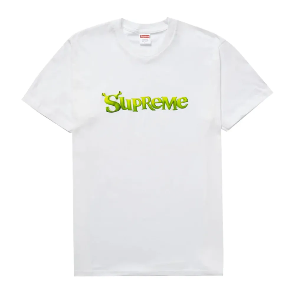 The Supreme Shrek Tee White features a screen-printed Supreme front graphic that nods to DreamWorks Animation’s 2001 cult-classic Shrek. Similar to the film’s logo, Shrek’s ogre ears are attached to the “S” in the graphic.