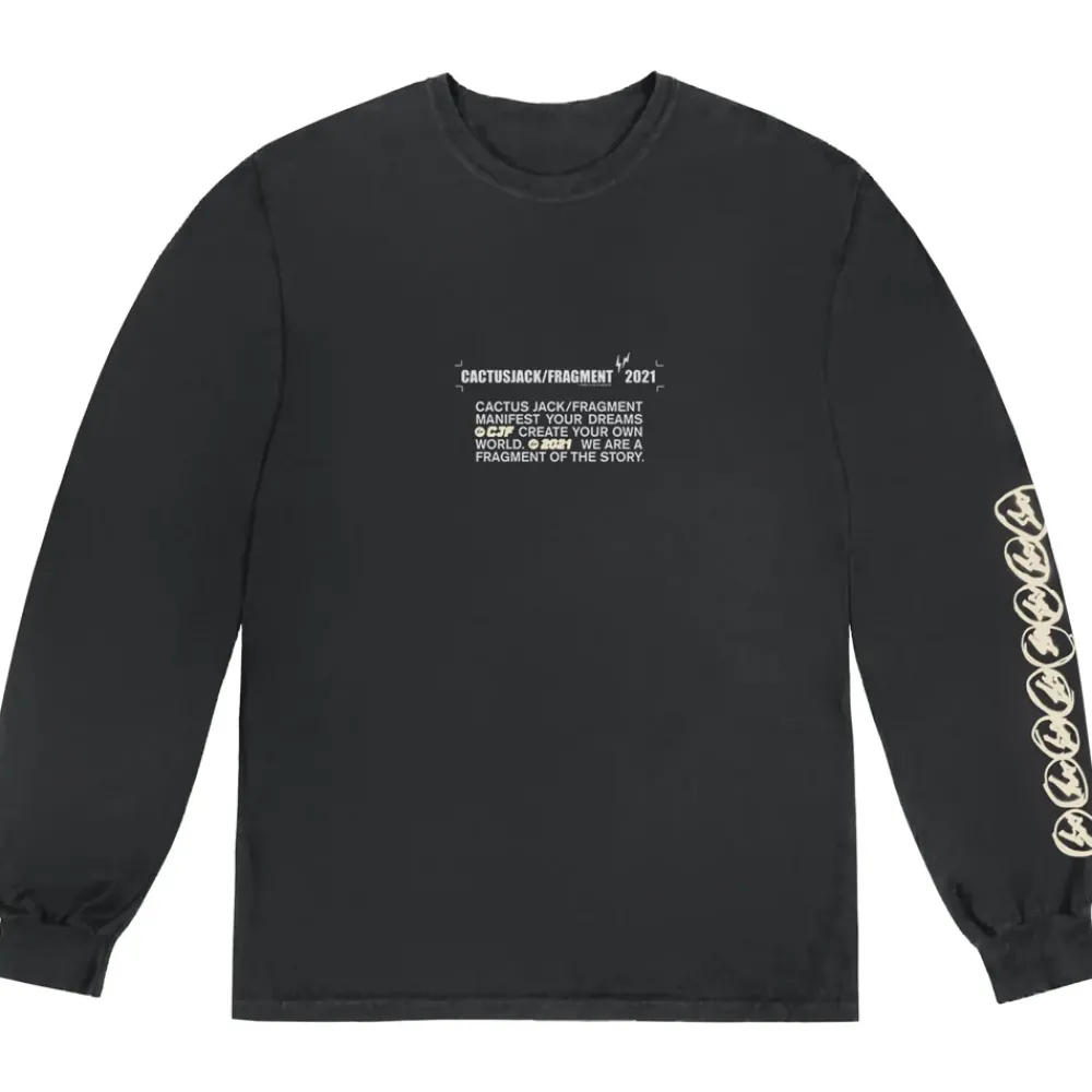 This Travis Scott x Fragment Long Sleeve T-Shirt features an array of graphics as well as branding from both partners.